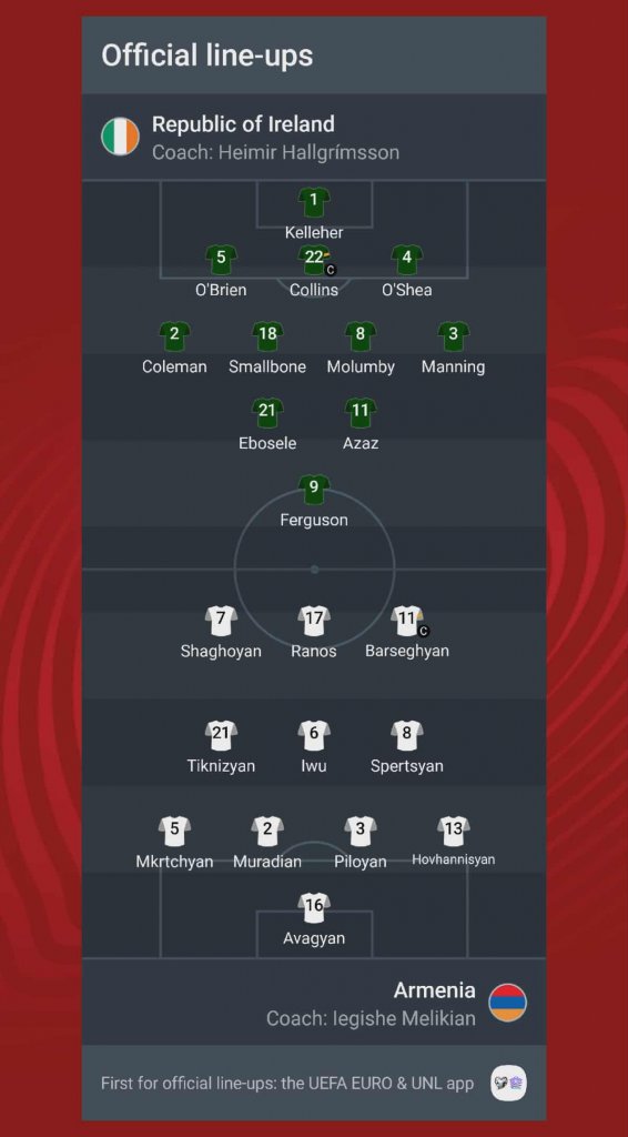 Իռլանդիա – Հայաստան. մեկնարկային կազմեր, ուղիղ եթեր
