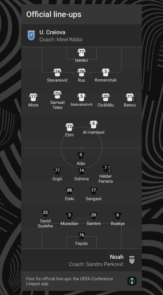 «Ունիվերսիտատեա Կրայովա» – «Նոա». մեկնարկային կազմեր, ուղիղ եթեր